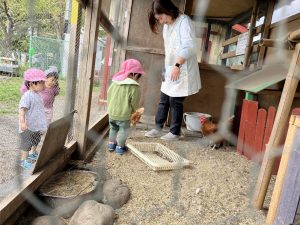 今日はとってもいい天気🌞 はじめて、なかよしひろばに行きました! 木のすべり台で遊んだり タンポポを摘んだり かんろ組のおともだちも 外の空気を吸ってうれしそう😊 先生がニワトリ小屋に入ったら 「入る~!」と名乗り出た勇気あるおともだち 一緒に入ってみたら・・・ 少し怖くなったようで、「出る~😢」と・・・ 出ようとしたら ニワトリさんも一緒にお外に出てしまいました🐔 お散歩に出たニワトリさん🐔は 勇気ある先生が確保して小屋に戻してくれました😊 先生ありがと~😊 Tweet Share RSS Pin it この記事のタイトルとURLをコピーする 投稿者: lumbini_root 日々のこと 始業式と花まつりのつどい🌸 前の記事 2025.4.18のできごと 次の記事