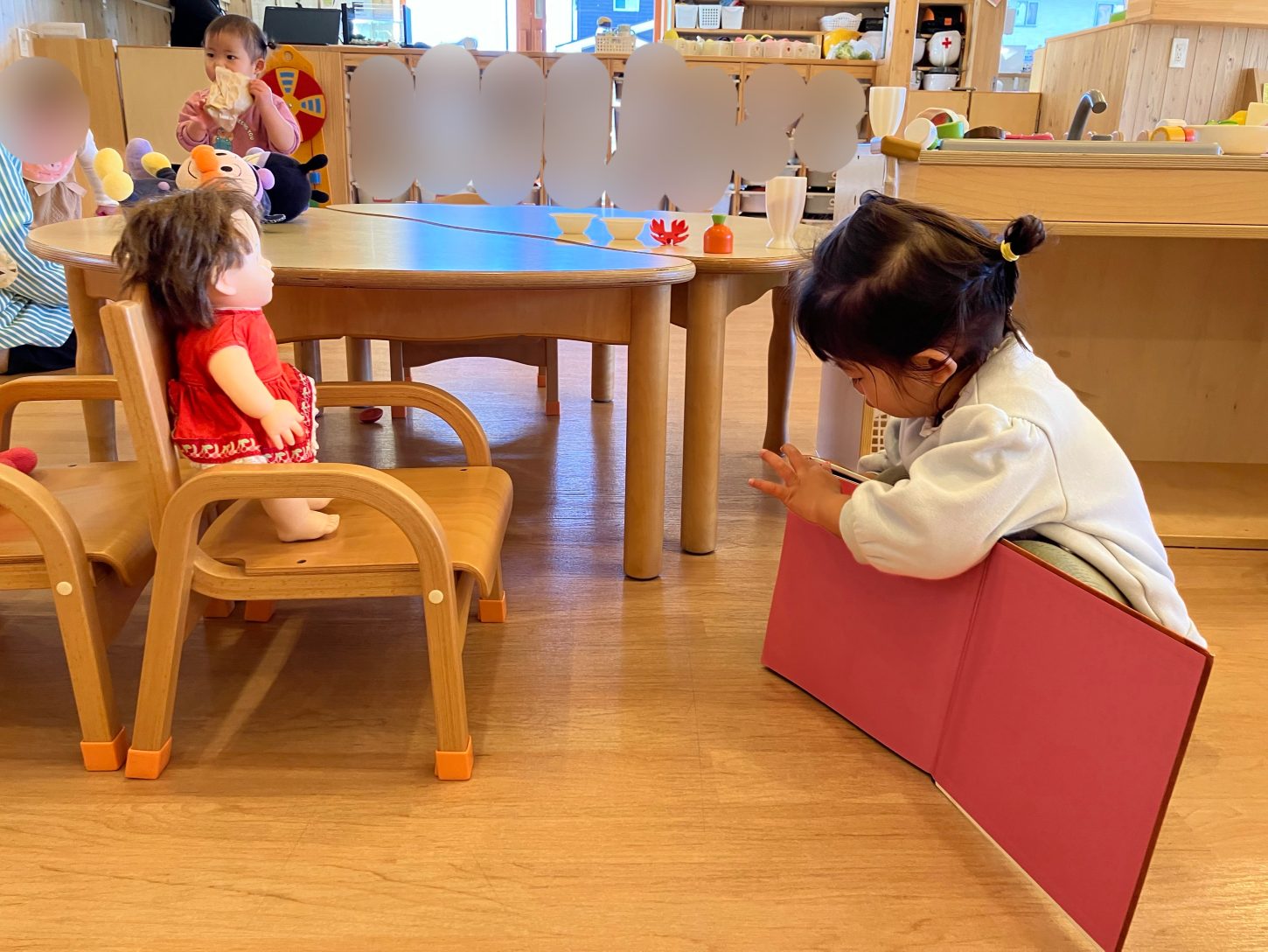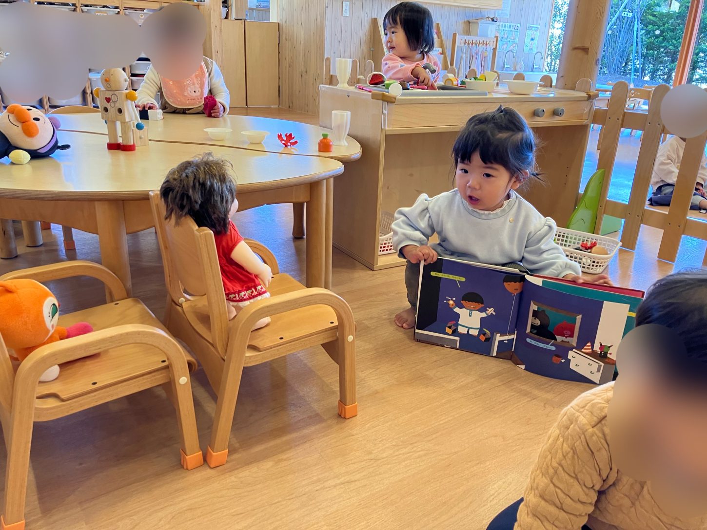 さらに、お人形さんを上手に椅子に座らせて、絵本の読み聞かせをしているお友達もいました(*´ω`)