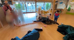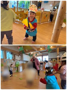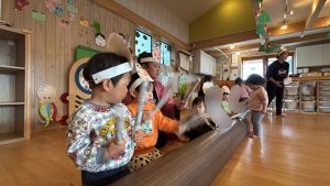 そしてお次は、丸太🪵を太鼓にしながらお囃子です。「てんてけすけてん」と歌いながらトントン叩いて楽しみました。