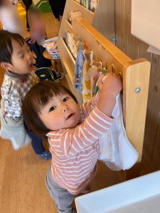 まずは登園したら、自分のタオルをタオルかけへ♡